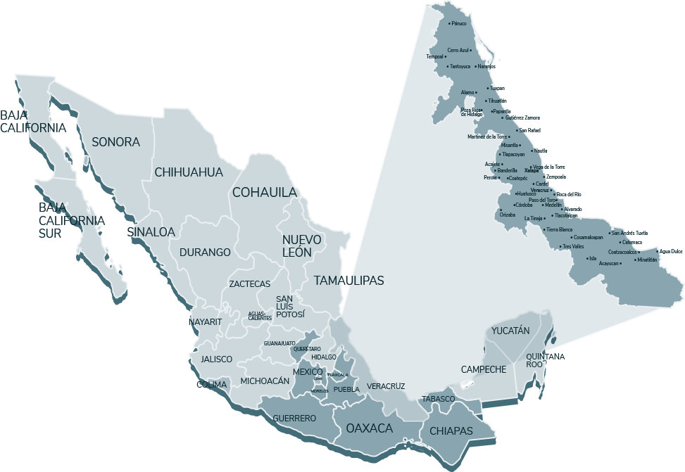 Veracruz, Puebla, Tabasco, Oaxaca, Chiapas, Estado de México, Querétaro, Guerrero, Tlaxcala, Morelos.